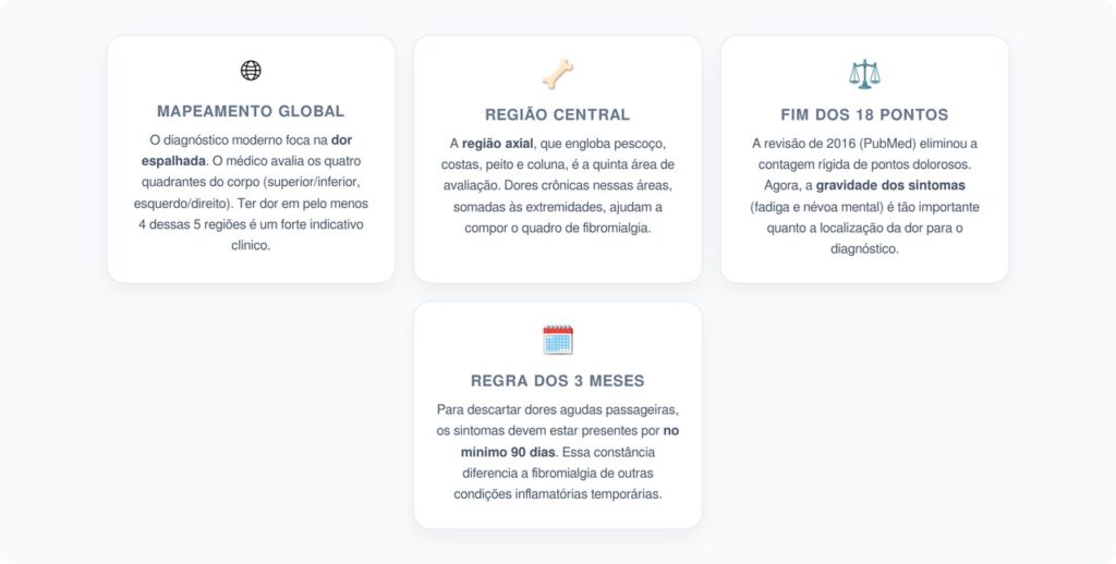 Os critérios mais atuais de diagnóstico, definidos pelo Colégio Americano de Reumatologia, deixaram de exigir a contagem dos antigos 18 pontos dolorosos. Hoje, o médico mapeia a dor com base em cinco grandes regiões do corpo, e o diagnóstico é considerado quando há dor em pelo menos quatro delas. Essas regiões são: