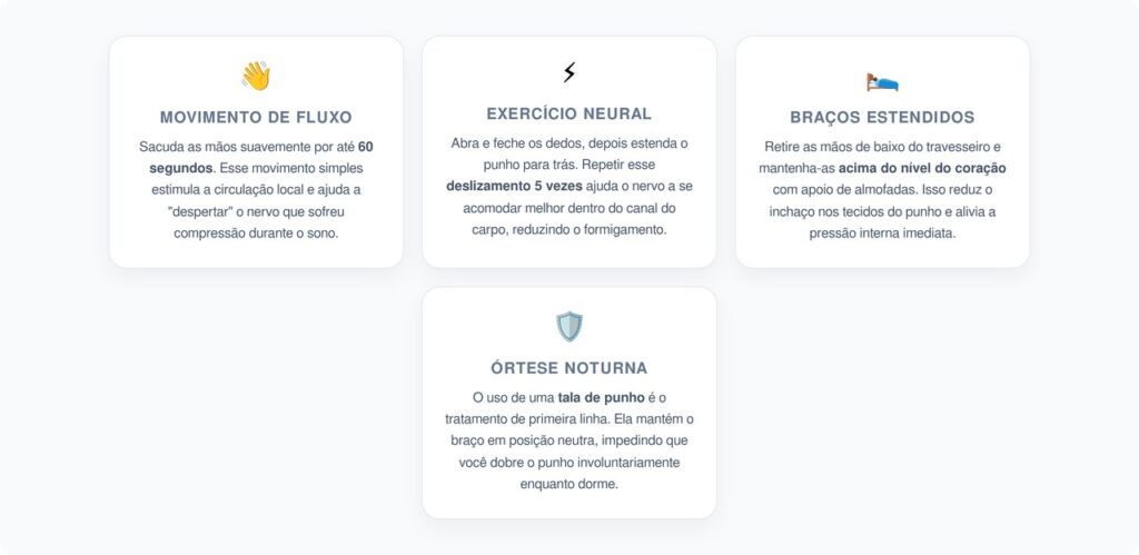 Uma das medidas mais estudadas e recomendadas para aliviar o formigamento noturno nas mãos é o uso de uma tala que mantém o punho em posição neutra durante o sono. Segundo a revisão sistemática da Cochrane intitulada “Splinting for carpal tunnel syndrome”, publicada na Cochrane Database of Systematic Reviews em 2023, o uso de talas noturnas é uma intervenção segura e com poucos efeitos colaterais que oferece alívio dos sintomas em casos leves a moderados de síndrome do túnel do carpo. A revisão analisou ensaios clínicos randomizados e concluiu que a imobilização do punho em posição neutra durante a noite reduz a pressão dentro do túnel do carpo, permitindo que o nervo mediano se recupere nas horas de repouso. Para muitas pessoas, essa medida simples é suficiente para eliminar os despertares noturnos causados pelo formigamento. Acesse a revisão completa neste link.