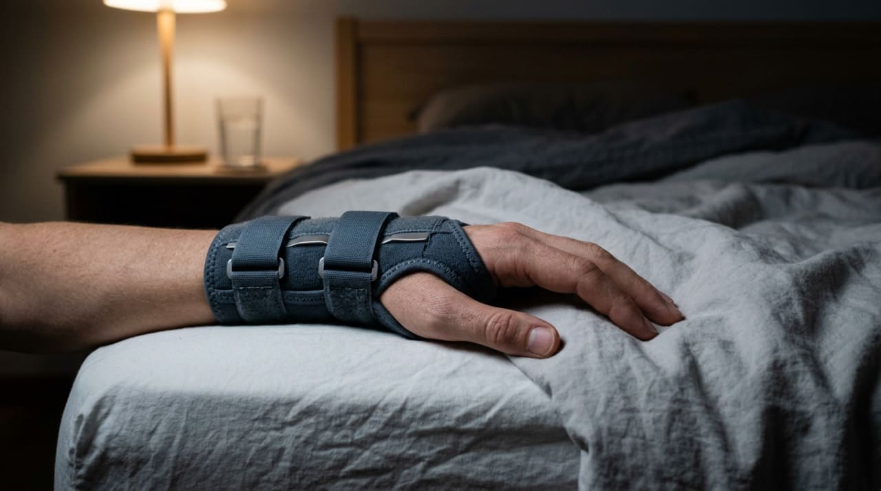 • Use uma tala noturna: órteses de punho pré-fabricadas ou sob medida mantêm o punho em posição neutra e evitam a flexão involuntária durante o sono, sendo o tratamento de primeira linha para o formigamento recorrente.