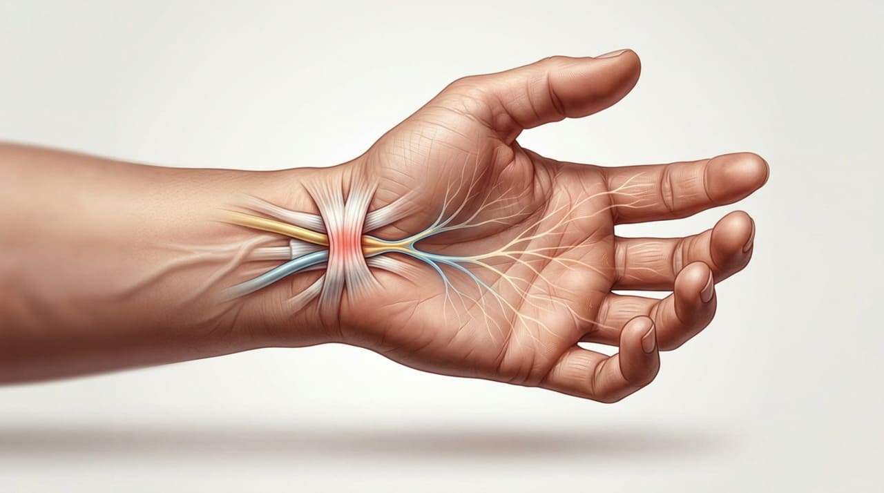 Ilustração mostra a compressão do nervo mediano no punho causando pressão e dor no túnel do carpo.