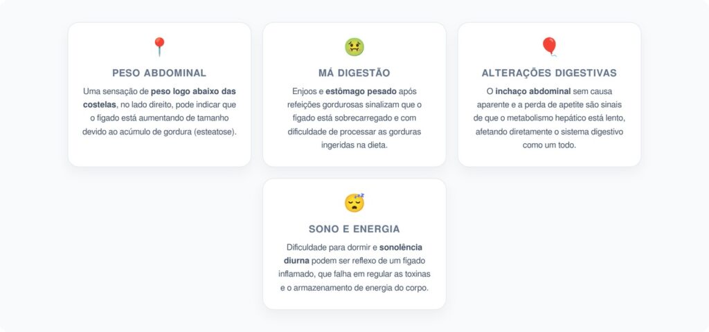 A gordura no fígado raramente dá sinais claros no início, o que torna o diagnóstico precoce mais difícil. Porém, alguns sintomas leves e inespecíficos podem funcionar como alerta quando aparecem em conjunto. Entre os mais comuns estão:
