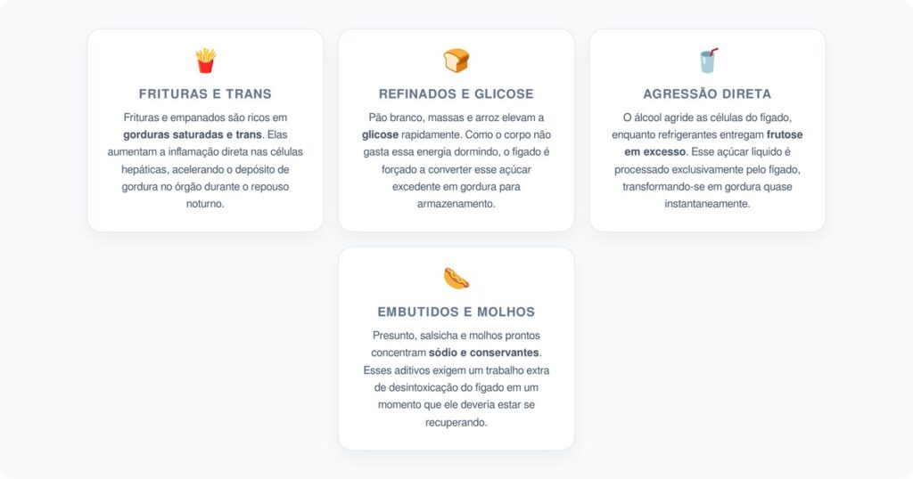 - Embutidos e molhos industrializados: presunto, salsicha, linguiça e molhos prontos concentram sódio, conservantes e gordura saturada que sobrecarregam o fígado durante a noite.