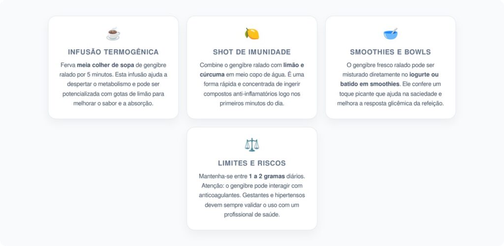 Existem maneiras simples de aproveitar os benefícios do gengibre logo no início do dia, sem complicar a rotina. As opções mais utilizadas incluem: