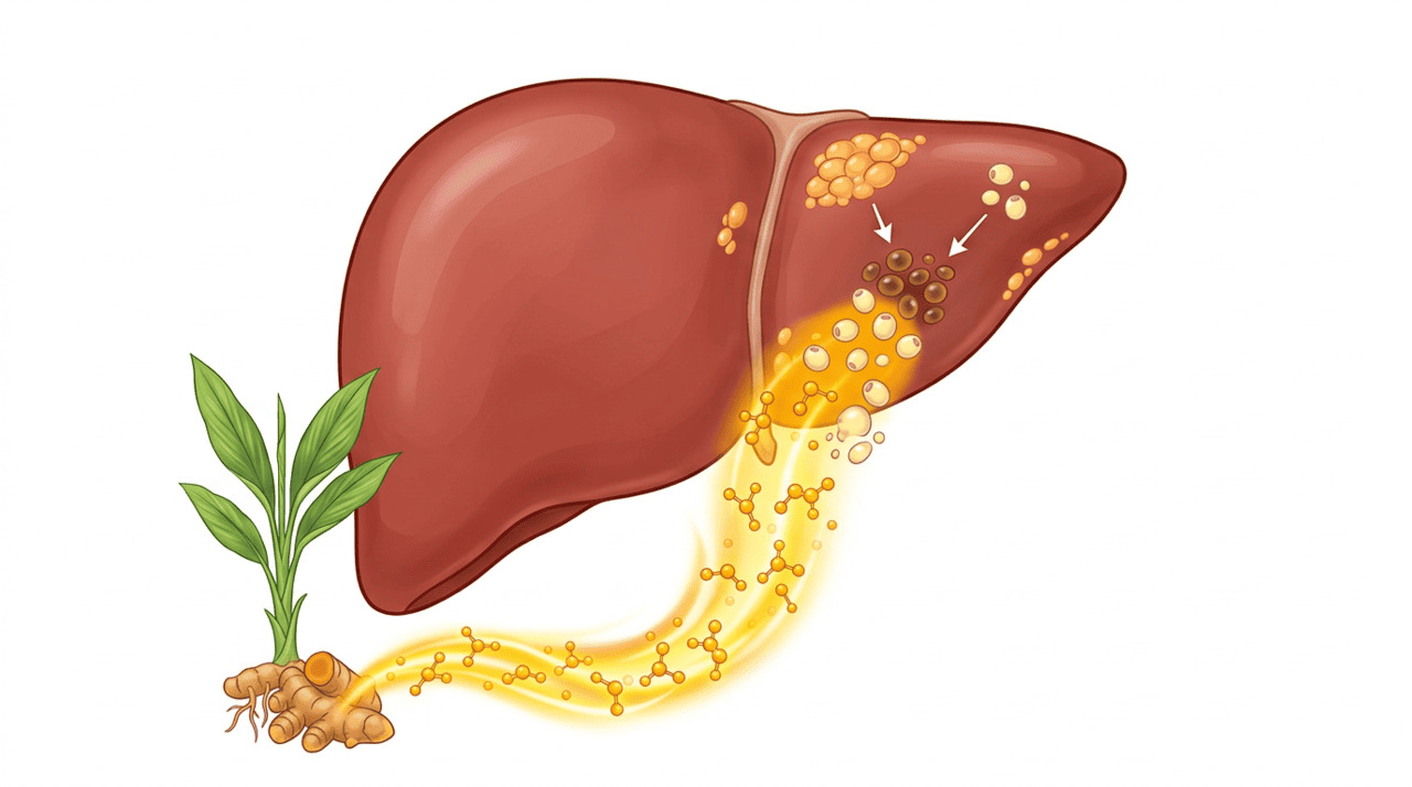 A curcumina age por diferentes mecanismos no fígado. Ela reduz o estresse oxidativo nas células hepáticas ao estimular a produção de glutationa, um antioxidante natural do organismo. Além disso, inibe vias inflamatórias que agravam a esteatose e ajuda a diminuir a síntese de triglicerídeos nas células do fígado, dificultando o acúmulo de gordura.