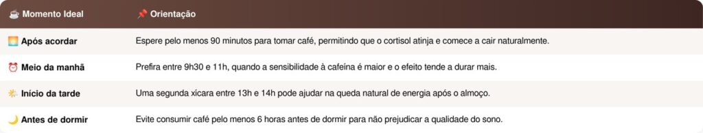 Com base no ritmo natural do cortisol, especialistas em cronobiologia recomendam consumir o café quando os níveis desse hormônio começam a cair, o que costuma acontecer após as 9h30 da manhã. Nesse momento, o corpo já passou pelo pico de alerta natural e a cafeína pode atuar de forma mais eficiente, prolongando a disposição sem sobrecarregar o sistema. Algumas orientações práticas para aproveitar melhor o café incluem: