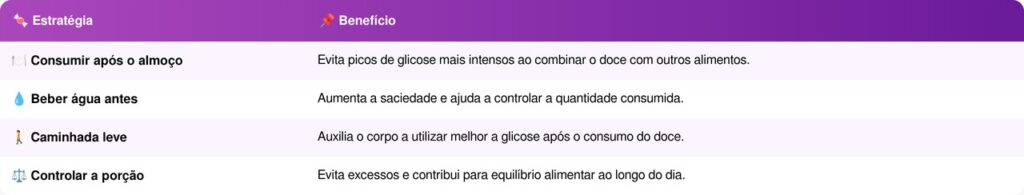 A melhor forma de incluir um doce na rotina sem grandes prejuízos é consumi-lo após uma refeição principal equilibrada, como o almoço. Quando o doce vem depois de um prato que contém fibras, proteínas e gorduras saudáveis, o açúcar é absorvido de forma mais lenta e o impacto nos níveis de glicose é menor. Algumas estratégias que ajudam a manter o equilíbrio incluem: