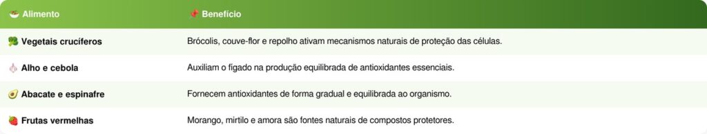 A estratégia mais segura para fortalecer as defesas do organismo é obter antioxidantes por meio de uma alimentação variada e equilibrada. Os alimentos oferecem esses compostos junto com fibras, vitaminas e minerais que trabalham em conjunto, permitindo que o corpo absorva apenas o que precisa. Alguns dos melhores alimentos para isso incluem: