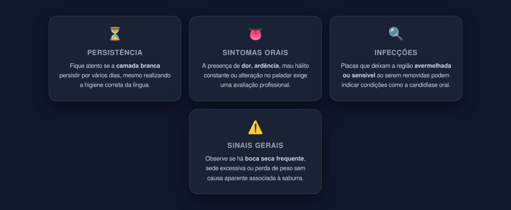 Na maioria dos casos, a saburra lingual desaparece com uma higiene adequada. Porém, existem situações que merecem atenção e avaliação profissional: