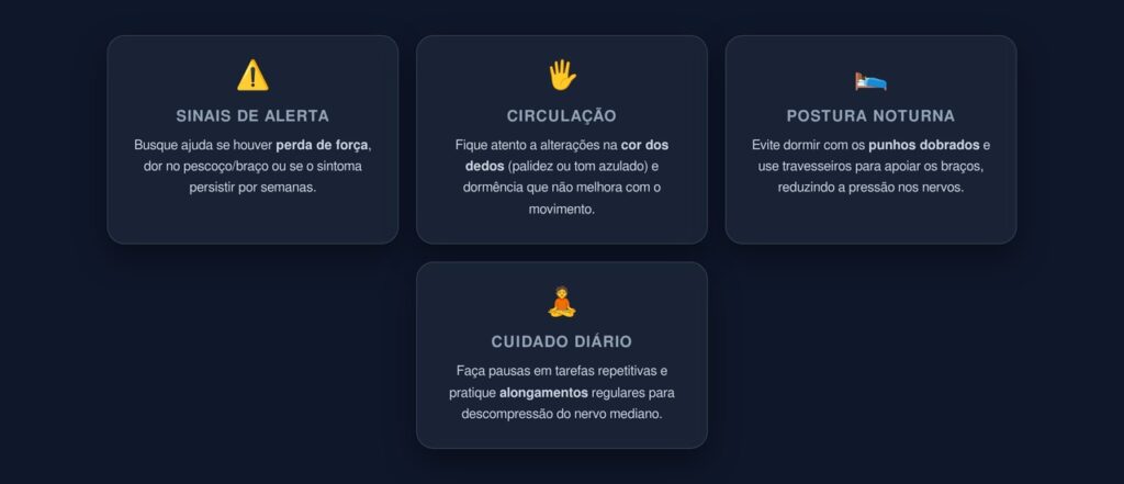 Algumas mudanças no dia a dia podem aliviar o desconforto nas mãos ao acordar. Evitar dormir com os punhos dobrados é uma medida eficaz, pois essa posição aumenta a pressão sobre o nervo mediano. Usar um travesseiro para apoiar os braços durante a noite também pode ajudar. Além disso, fazer pausas regulares em atividades repetitivas, como digitação, e praticar alongamentos para mãos e punhos contribui para reduzir a sobrecarga nos nervos.