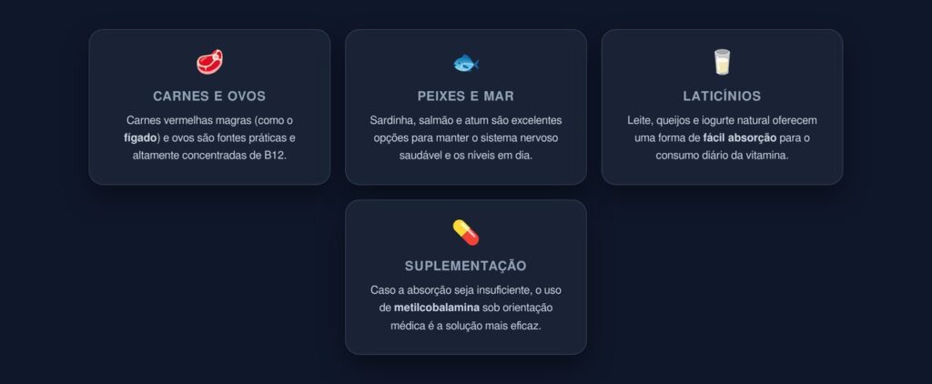 A principal forma de obter vitamina B12 é através da alimentação. Incluir fontes desse nutriente no dia a dia, preferencialmente na primeira metade do dia, favorece a absorção e contribui para manter os nervos saudáveis. As melhores fontes alimentares são: