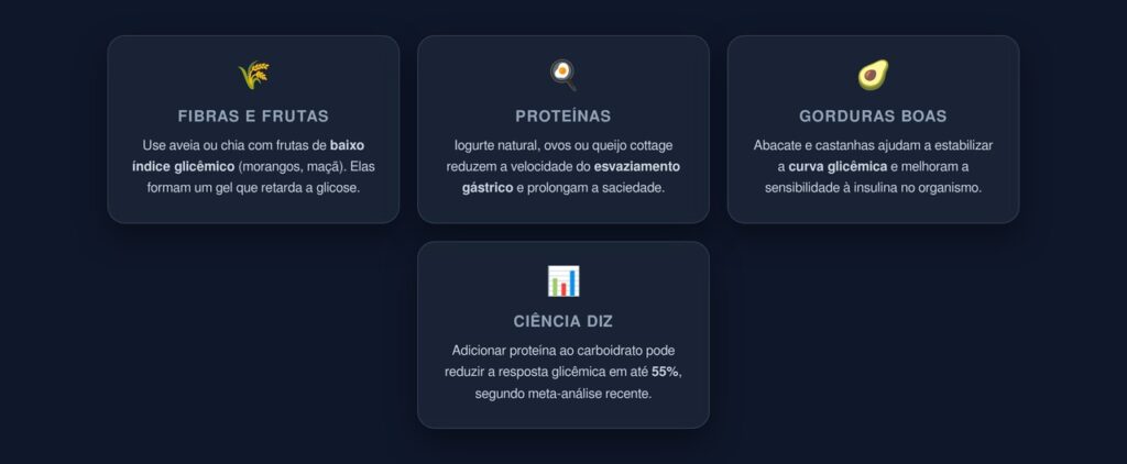 A lógica é simples: combinar fibras que retardam a digestão, proteínas que estimulam a saciedade e gorduras boas que modulam a resposta insulínica. Veja como montar um lanche da manhã com essa função: