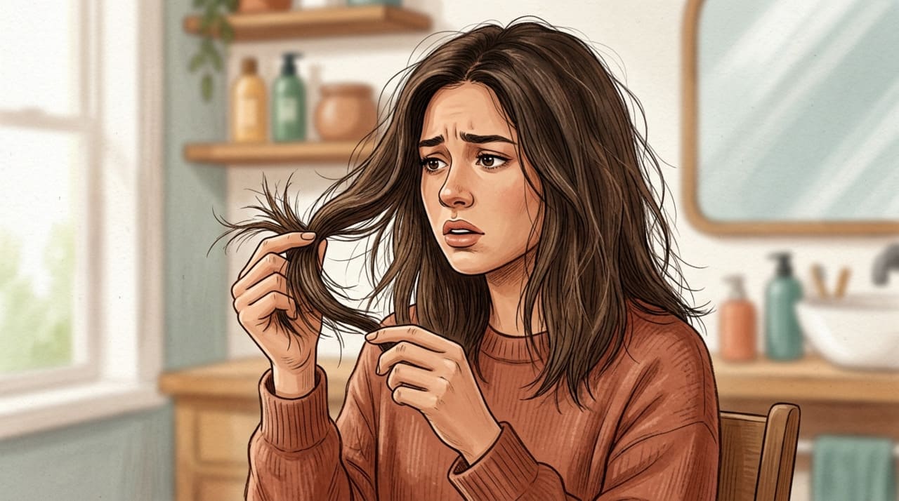 • Fios quebradiços e secos podem estar relacionados a problemas na tireoide ou falta de nutrientes como ferro e zinco