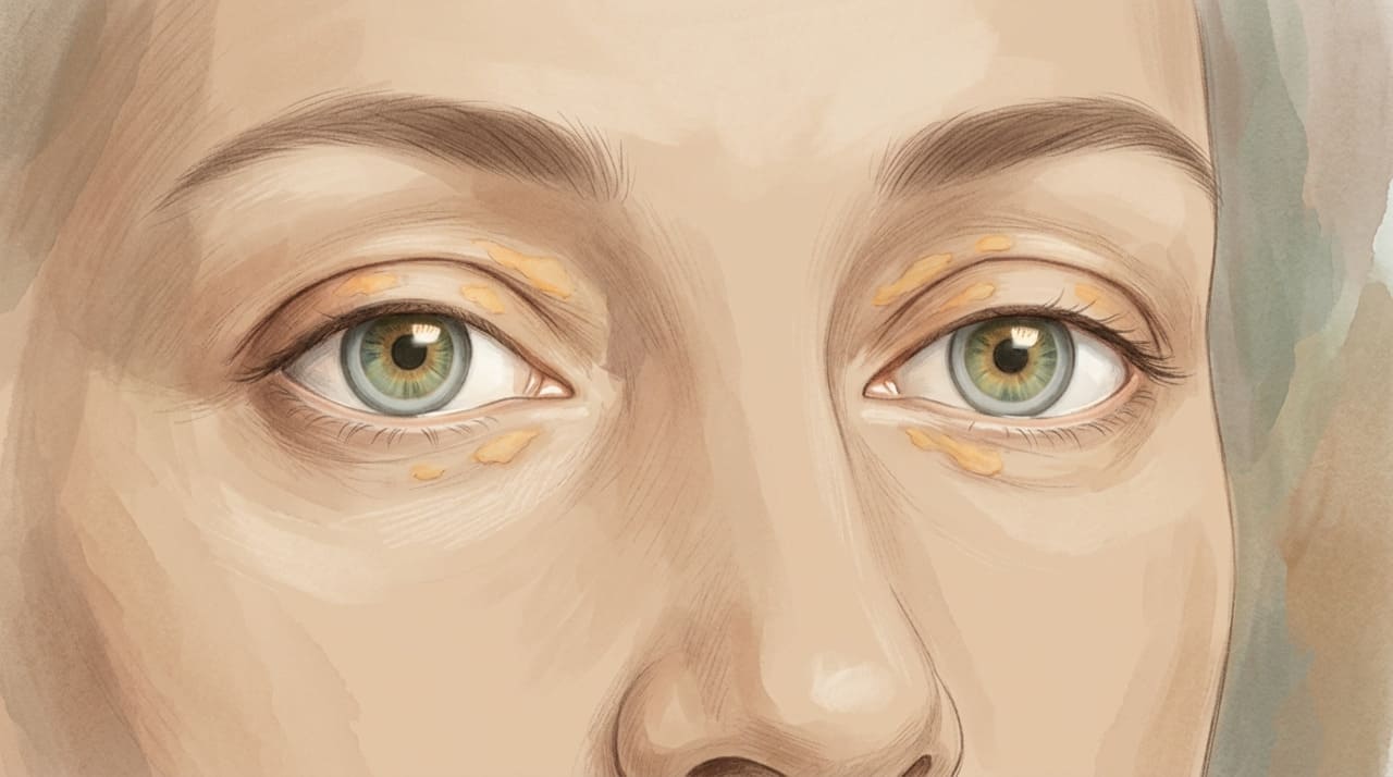As placas amareladas que surgem ao redor dos olhos, especialmente próximas ao canto interno das pálpebras, são conhecidas como xantelasmas. Elas são formadas pelo acúmulo de gordura sob a pele e costumam aparecer de forma simétrica em ambos os olhos. Embora sejam indolores e não afetem a visão, representam um sinal visual de que pode haver alterações no metabolismo das gorduras.
