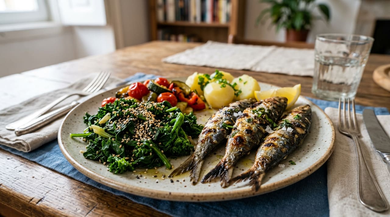 - Sardinha assada ou grelhada: além de ser uma das maiores fontes alimentares de cálcio (especialmente quando consumida com espinhas), fornece ômega-3, vitamina D e proteínas.