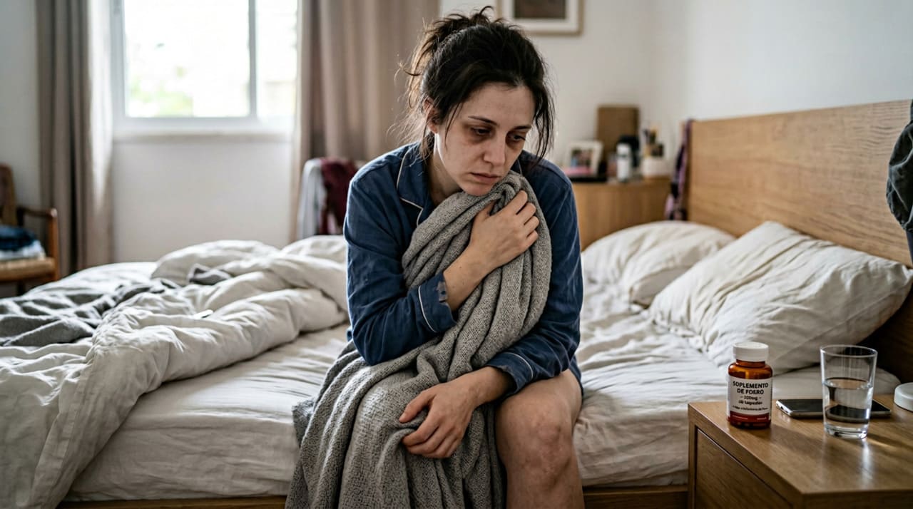 Essa fase, conhecida como deficiência de ferro sem anemia, já provoca sintomas reais e limitantes no dia a dia. A pessoa sente fadiga muscular, falta de fôlego desproporcional ao esforço, dificuldade para manter o foco e uma exaustão que não melhora com repouso. É uma condição frequentemente confundida com estresse, depressão ou simplesmente cansaço “da rotina”.