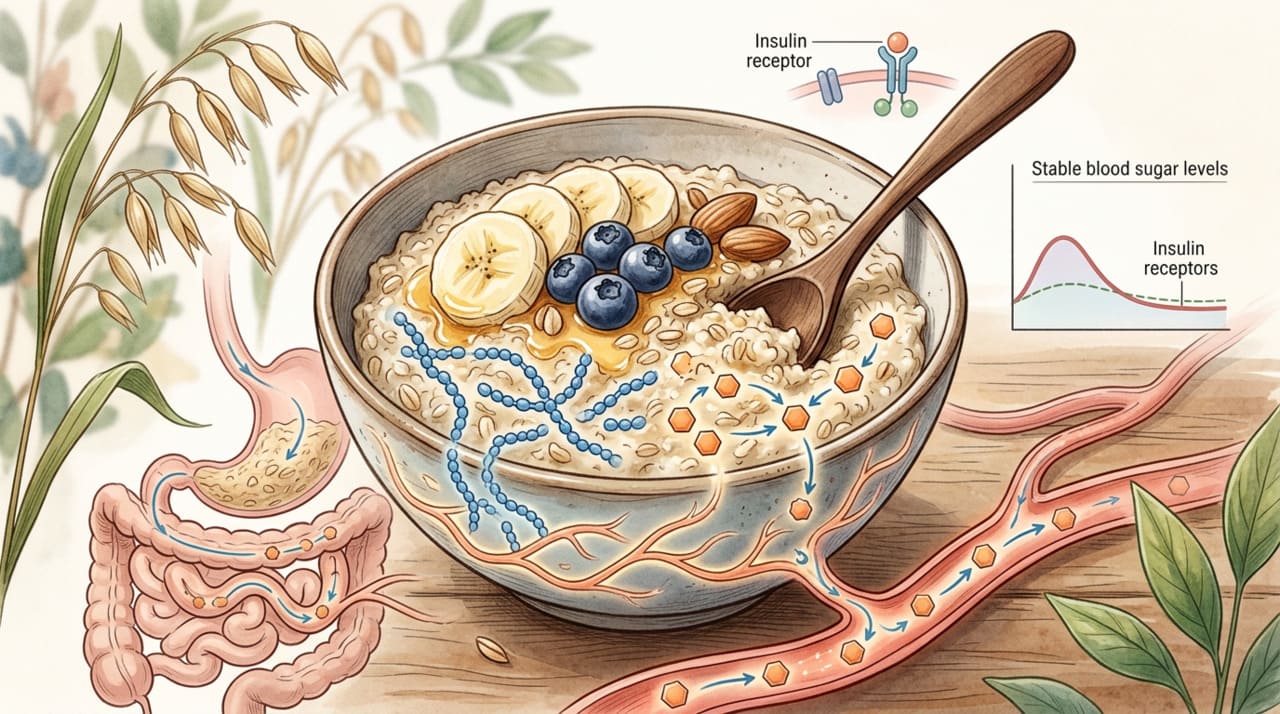 Quando você come aveia, a beta-glucana presente nos flocos se dissolve e cria uma camada viscosa dentro do trato digestivo. Essa camada funciona como uma barreira natural que desacelera a passagem dos carboidratos para a corrente sanguínea. Com a glicose entrando de forma mais lenta, o pâncreas não precisa liberar grandes quantidades de insulina de uma vez, o que ajuda a evitar a sobrecarga desse órgão ao longo dos anos.