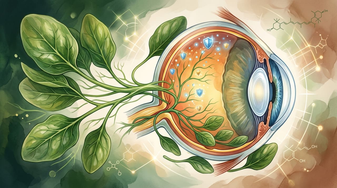 O espinafre é uma das fontes mais ricas de luteína e zeaxantina, duas substâncias naturais que se depositam na região central da retina, chamada mácula. Esses compostos funcionam como um filtro natural contra a luz azul e combatem os radicais livres que danificam as células dos olhos ao longo dos anos.