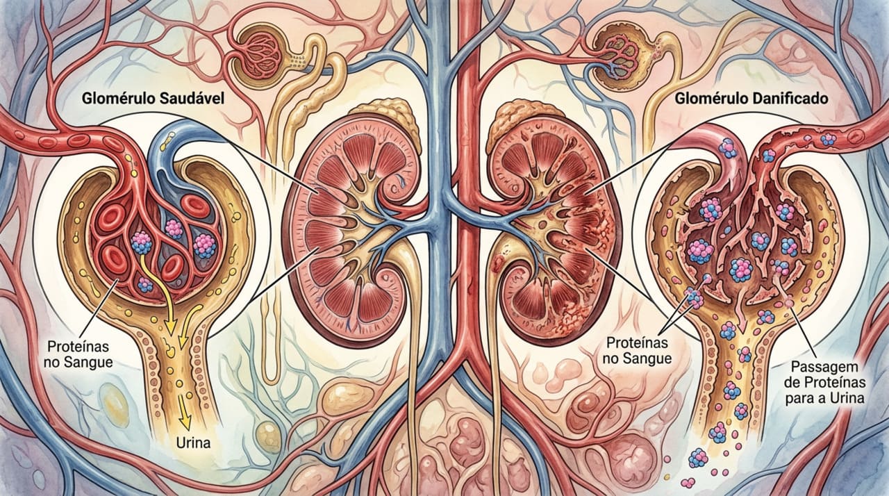 Os rins funcionam como filtros que selecionam o que deve ser eliminado e o que precisa permanecer no sangue. As proteínas são moléculas grandes e essenciais que, em condições normais, não passam por esses filtros. Quando surgem na urina, é sinal de que a estrutura de filtragem está comprometida.