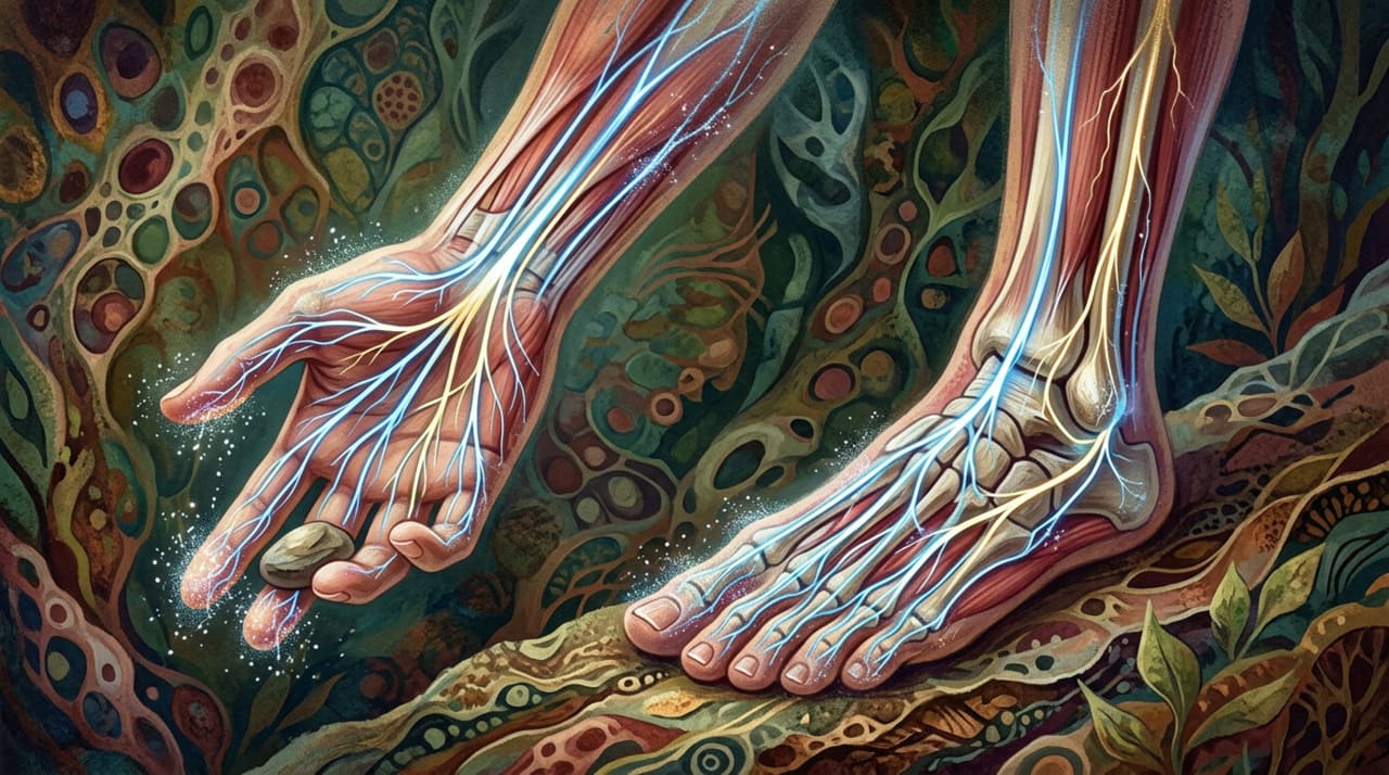 A vitamina B12 participa diretamente da manutenção da camada que reveste e protege os nervos em todo o corpo. Quando seus níveis ficam baixos por tempo prolongado, essa camada protetora começa a se deteriorar, prejudicando a transmissão dos sinais entre o cérebro e as extremidades do corpo. É esse processo que gera o formigamento simétrico nas mãos e nos pés.