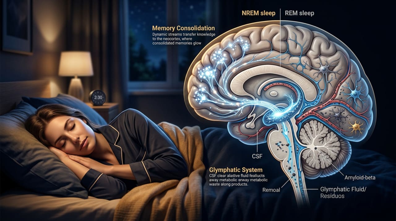 Durante o sono profundo, o cérebro realiza duas funções essenciais para a memória. A primeira é a consolidação das informações aprendidas durante o dia, transferindo-as da memória de curto prazo para a memória de longo prazo. A segunda é a ativação do sistema glinfático, uma espécie de rede de limpeza que remove proteínas tóxicas acumuladas ao longo das horas em que você ficou acordado.