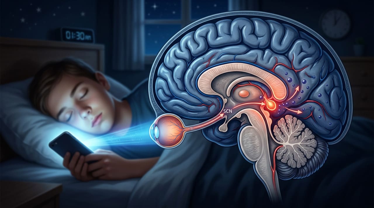 A luz azul emitida por celulares, tablets e computadores envia ao cérebro um sinal de que ainda é dia, inibindo a produção de melatonina, o hormônio que prepara o corpo para dormir. Quanto mais tempo de exposição à tela antes de deitar, mais difícil se torna iniciar o sono e maior a chance de acordar durante a noite.
