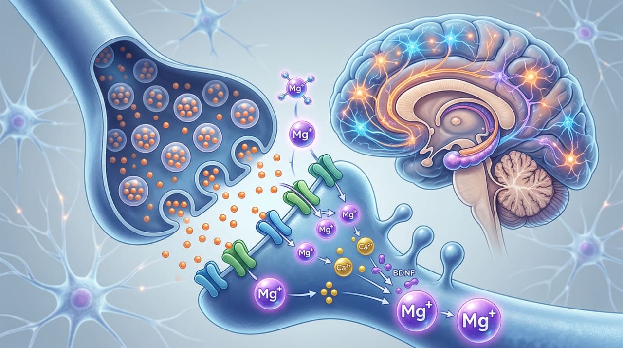 O magnésio treonato é formado pela ligação do mineral com o ácido treônico, um derivado da vitamina C. O grande diferencial dessa forma é justamente a capacidade de atravessar a barreira que protege o sistema nervoso central, alcançando os neurônios de maneira mais eficaz. Ao elevar os níveis de magnésio no cérebro, o treonato favorece a plasticidade sináptica, que é a capacidade das células nervosas de formar e fortalecer conexões entre si.