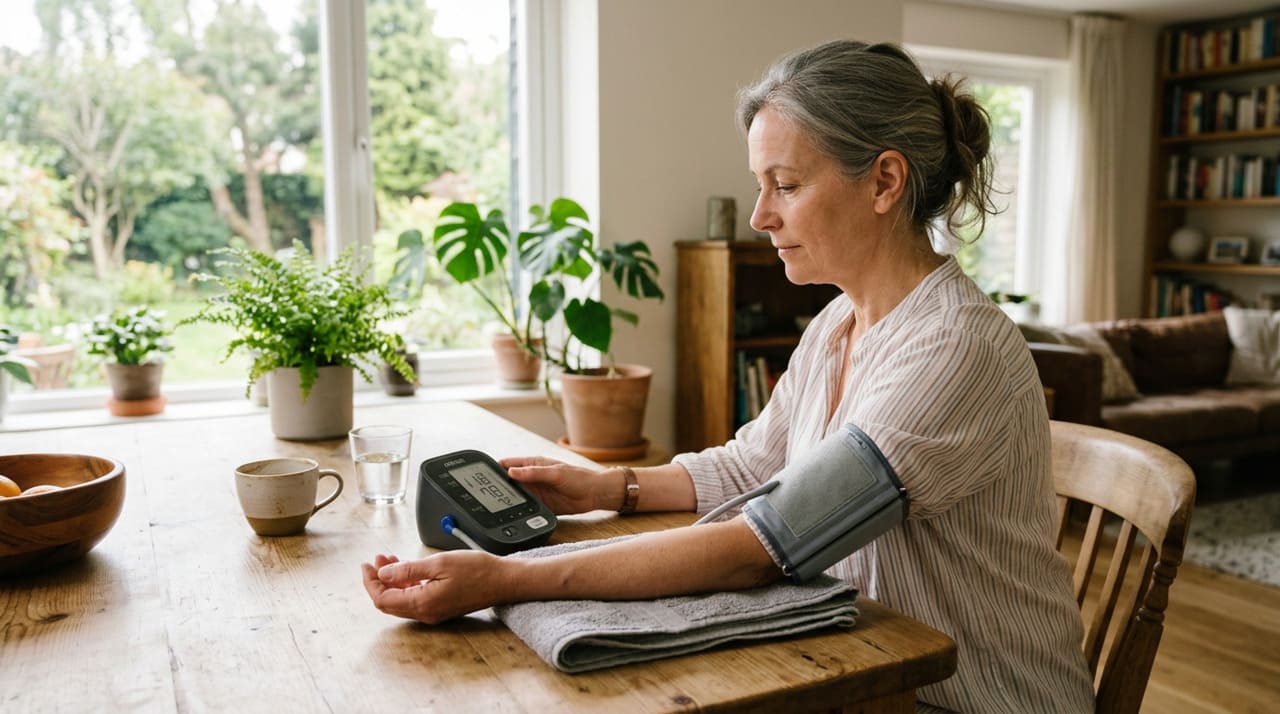 Pessoa mede a pressão em casa com postura correta e braçadeira ajustada
