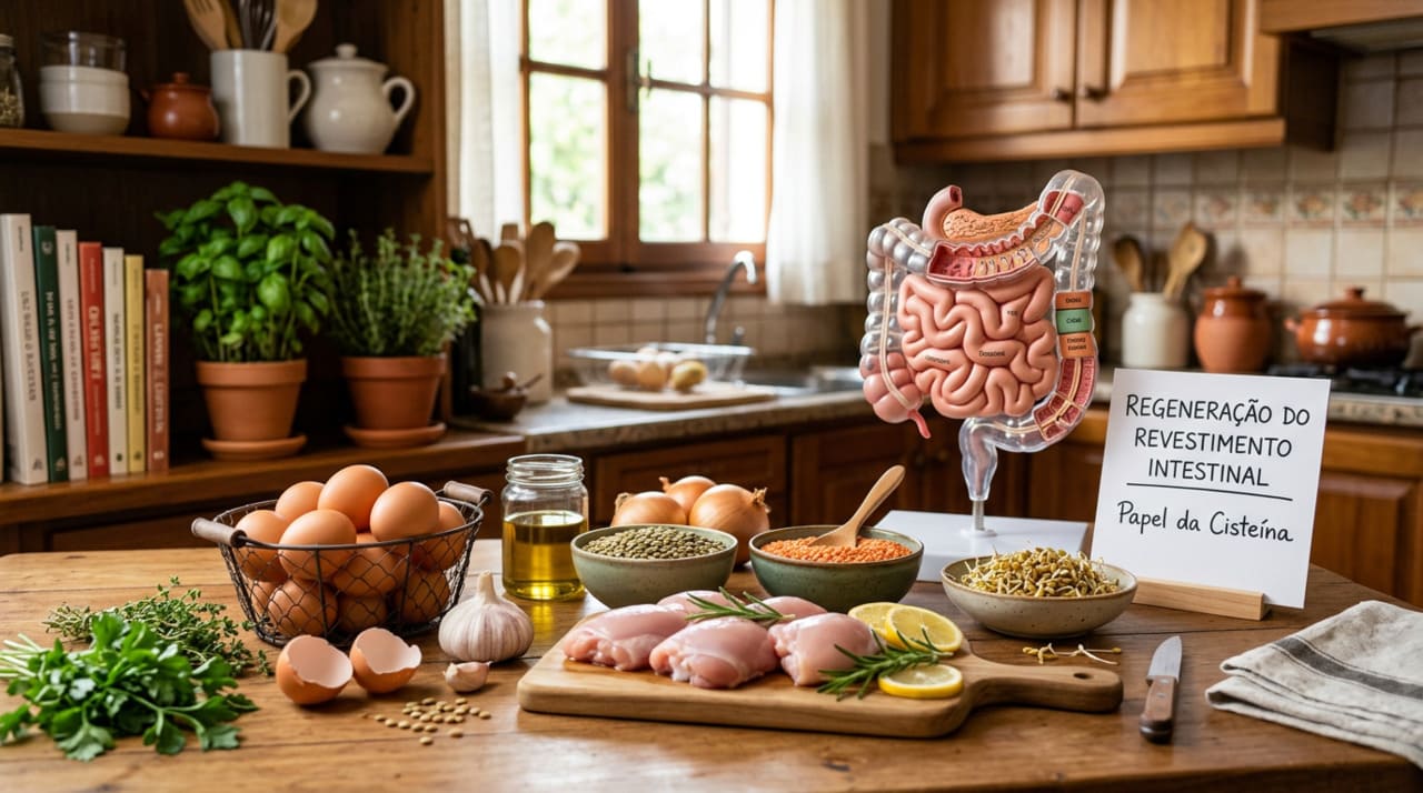 A cisteína é um aminoácido que o corpo utiliza para diversas funções, incluindo a proteção das células contra danos e o apoio ao sistema de defesa do organismo. Embora o fígado consiga produzi-la em pequenas quantidades, é pela alimentação que ela chega de forma mais concentrada ao intestino, onde exerce seus efeitos mais expressivos.