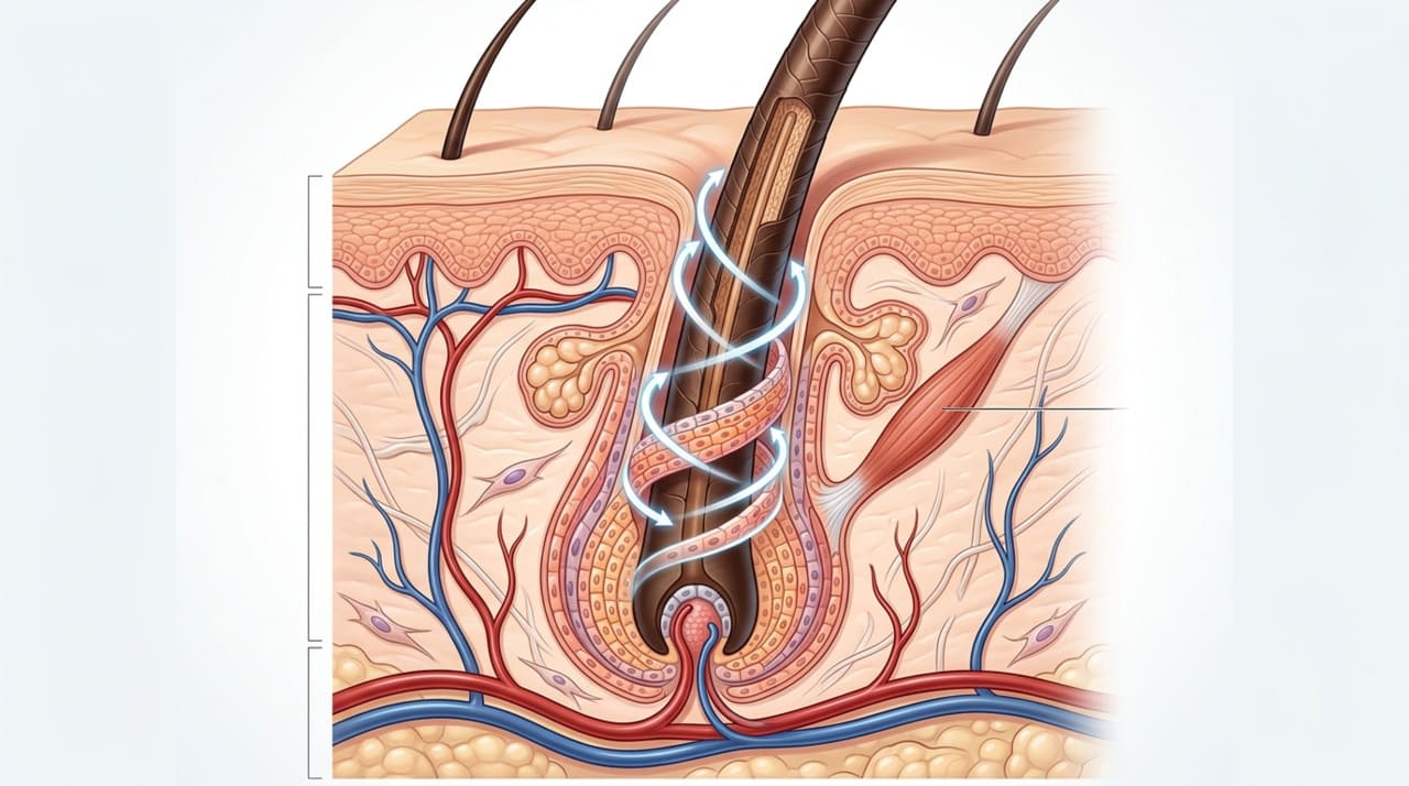 Pesquisadores da L’Oréal Research & Innovation e da Queen Mary University of London usaram um sistema avançado de imagem 3D para observar, em tempo real, células individuais dentro de folículos capilares humanos mantidos vivos em laboratório. Eles identificaram que as células da chamada bainha radicular externa, a camada que envolve o fio, se movimentam em um padrão espiral descendente e, ao fazer isso, geram uma força que puxa o cabelo para cima.