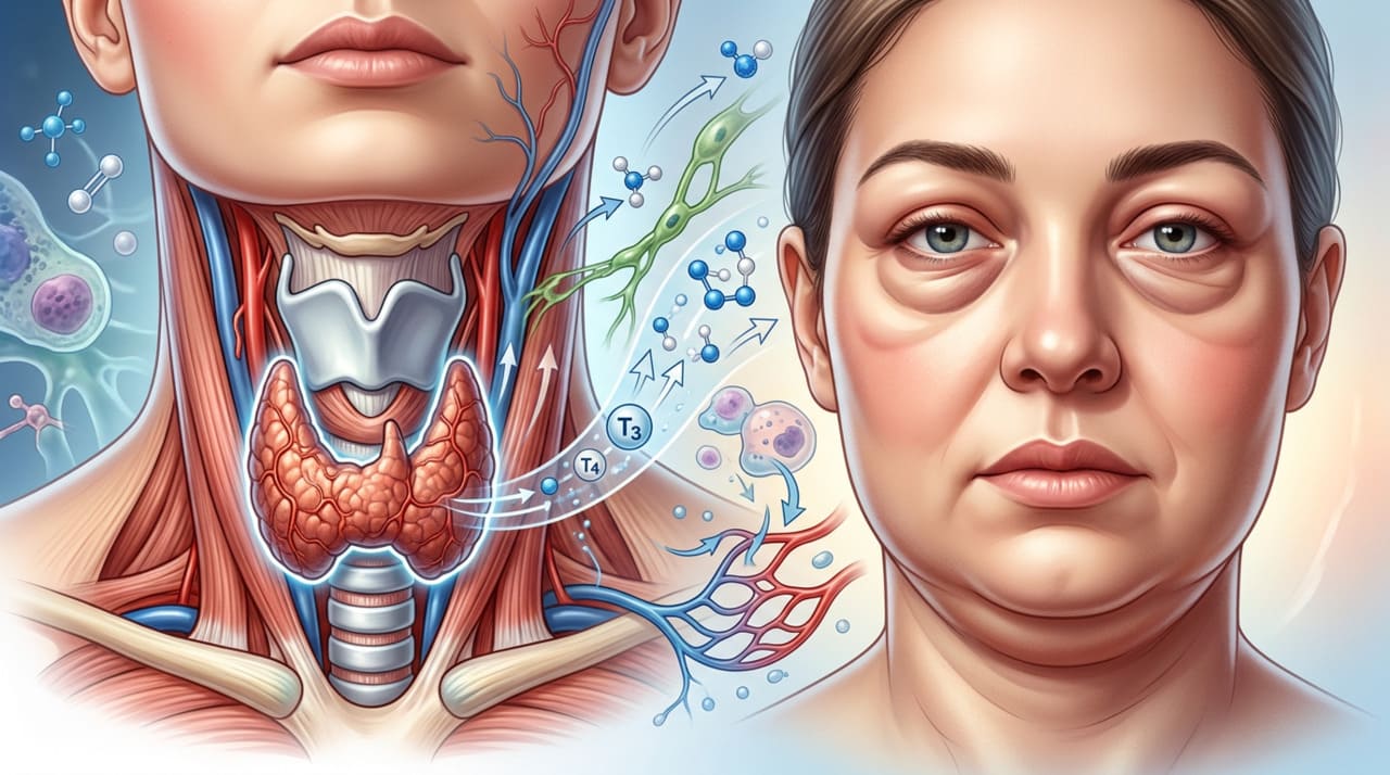 A tireoide é uma glândula localizada na parte da frente do pescoço, responsável por produzir hormônios que regulam o funcionamento de praticamente todo o organismo. Quando ela trabalha mais devagar do que deveria, os níveis dos hormônios T3 e T4 caem. Com essa queda, o corpo passa a reter líquidos com mais facilidade e substâncias se acumulam sob a pele, especialmente na região do rosto e ao redor dos olhos.