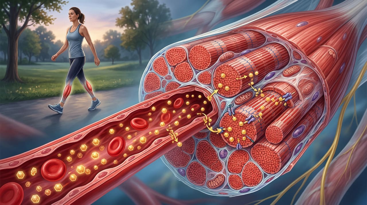 O segredo da caminhada pós-refeição não está na intensidade, mas no mecanismo que ela ativa nos músculos. Quando as pernas se movimentam, as contrações musculares ativam um transportador de glicose chamado GLUT4, que capta o açúcar do sangue para dentro das células musculares de forma independente da insulina. Isso significa que os músculos conseguem “puxar” a glicose mesmo quando a insulina não está funcionando direito.
