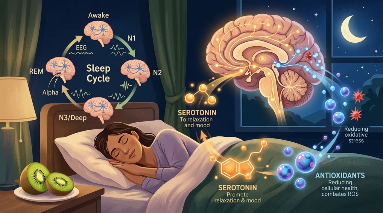 O kiwi contém serotonina, uma substância que o corpo usa para regular o ciclo de sono e vigília. Quando consumido à noite, essa serotonina natural contribui para que o organismo entre mais facilmente em estado de relaxamento. Além disso, a fruta oferece vitamina C, vitamina E e folato, nutrientes com ação antioxidante que ajudam a reduzir processos inflamatórios relacionados à má qualidade do sono.