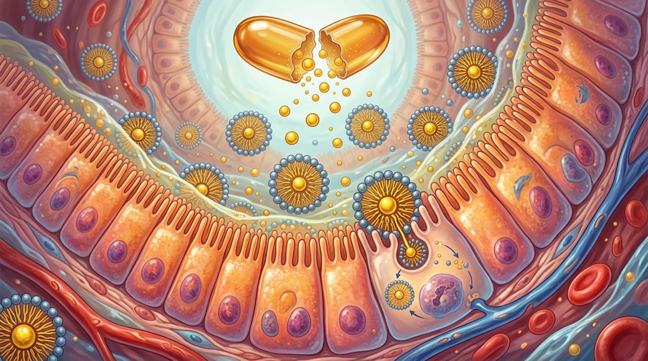 Diferentemente das vitaminas do complexo B e da vitamina C, que são solúveis em água, a vitamina D pertence ao grupo das vitaminas lipossolúveis, junto com as vitaminas A, E e K. Isso significa que ela só consegue ser absorvida pelo intestino delgado quando está misturada com gorduras. Durante a digestão, a vitamina D se incorpora a estruturas chamadas micelas, que são formadas a partir dos lipídios da refeição. Essas micelas transportam a vitamina através da parede intestinal até a corrente sanguínea.
