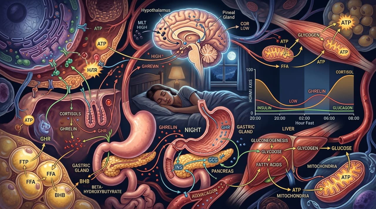 Durante o sono, o organismo continua realizando funções essenciais como a regeneração celular, a regulação da glicose e a produção de hormônios. Quando não há nutrientes disponíveis, o corpo recorre às reservas de glicogênio armazenadas no fígado para manter essas atividades. O problema é que essas reservas são limitadas e, ao se esgotarem, o organismo passa a buscar energia em outras fontes, como a massa muscular.