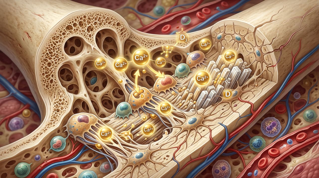 O cálcio é o principal mineral que forma a estrutura dos ossos, mas ele depende diretamente da vitamina D para ser absorvido pelo intestino e incorporado ao tecido ósseo. Sem vitamina D suficiente, mesmo uma alimentação rica em cálcio não consegue garantir que esse mineral chegue onde é necessário. O resultado é um enfraquecimento progressivo dos ossos.