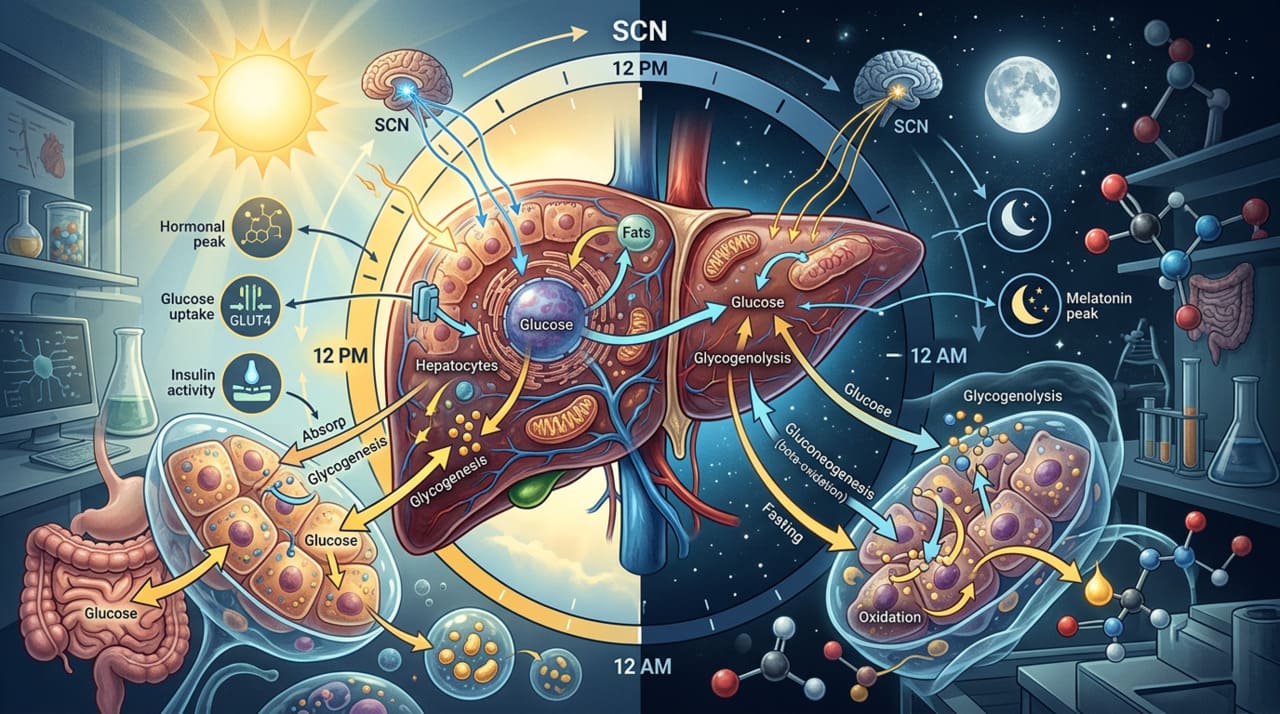 Assim como o cérebro possui um relógio central que regula o sono e a vigília, o fígado tem o seu próprio sistema de tempo, chamado de relógio circadiano periférico. Esse mecanismo coordena a atividade de milhares de genes que controlam a forma como açúcares, gorduras e proteínas são processados. Cerca de 40% dos genes ativos no fígado seguem um ritmo de 24 horas, alternando entre períodos de maior e menor atividade.