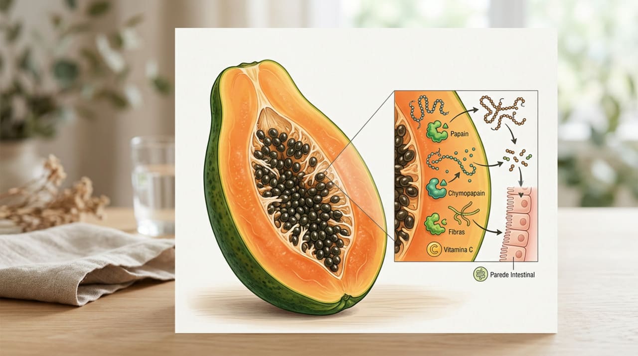 A papaína é uma enzima presente na polpa e no látex do mamão que age de forma semelhante ao suco gástrico, quebrando as proteínas dos alimentos em aminoácidos menores. Quando o mamão é consumido em jejum, essa enzima encontra o estômago sem a presença de outros alimentos, o que pode otimizar sua ação e preparar o sistema digestivo para as refeições seguintes.