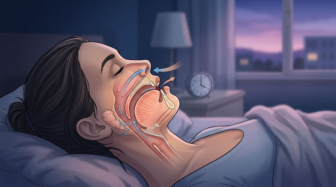 A apneia obstrutiva do sono é uma das causas mais subestimadas da boca seca noturna e sua ligação com esse sintoma tem respaldo científico claro. Durante os episódios de obstrução das vias aéreas, o corpo abre a boca para tentar puxar o ar, o que resseca rapidamente toda a mucosa oral ao longo da madrugada.