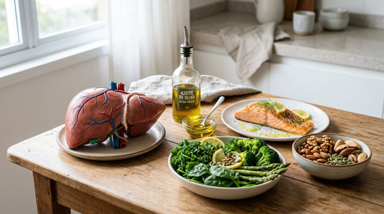 A alimentação tem papel central na recuperação do fígado. A dieta mediterrânea, rica em azeite de oliva, peixes, vegetais e grãos integrais, é considerada o padrão alimentar mais indicado para quem tem esteatose hepática. Alguns alimentos merecem destaque especial: