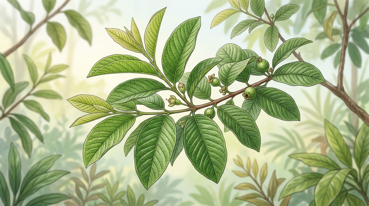 As folhas de goiabeira são ricas em taninos, flavonoides e óleos essenciais, substâncias responsáveis pelo seu potencial terapêutico. Entre os flavonoides, destaca-se a quercetina, reconhecida por sua ação antioxidante e anti-inflamatória natural no organismo.
