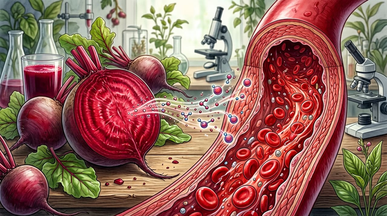 Quando você consome beterraba, os nitratos presentes no alimento são convertidos em nitrito pelas bactérias da boca e, em seguida, em óxido nítrico no estômago e nos vasos sanguíneos. Esse óxido nítrico relaxa as paredes das artérias, permitindo que o sangue flua com menos resistência e reduzindo a pressão exercida sobre os vasos.