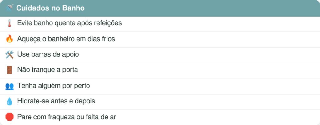Além disso, o sistema cardiovascular responde de forma diferente ao calor nessa faixa etária, com maior risco de variações na pressão arterial e episódios de tontura ao sair do chuveiro ou da banheira.