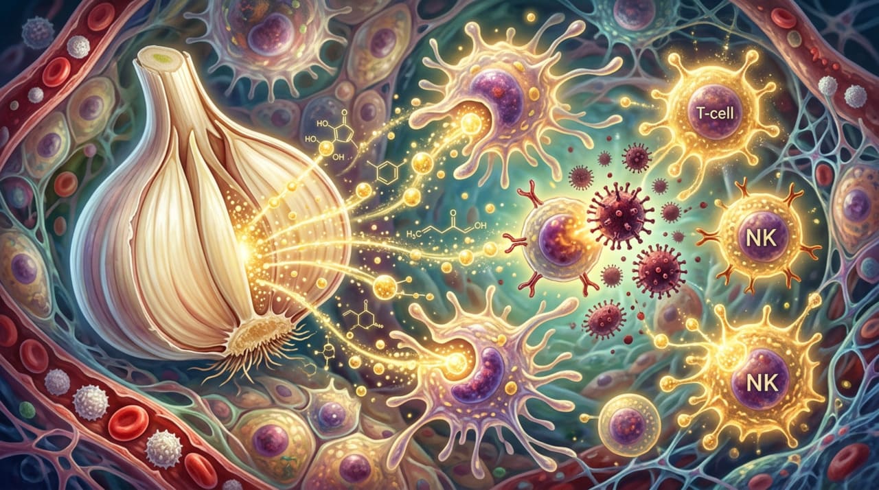 Além disso, a alicina estimula as células de defesa do organismo, como os linfócitos e as células natural killer, que são responsáveis por identificar e destruir agentes invasores. Essa ação fortalece tanto a imunidade inata quanto a adaptativa, deixando o corpo mais preparado para reagir a ameaças.