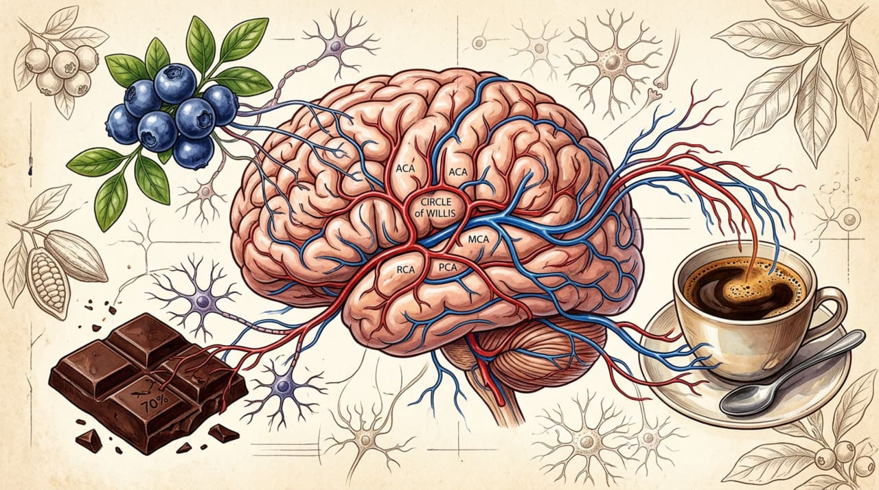 O chocolate amargo com pelo menos 70% de cacau é rico em flavonoides, catequinas e epicatequinas, compostos que melhoram o fluxo sanguíneo no cérebro e protegem os neurônios contra danos oxidativos. Além disso, contém teobromina e pequenas quantidades de cafeína, que proporcionam um estímulo suave ao sistema nervoso central. Os principais efeitos do chocolate amargo na saúde cerebral incluem: