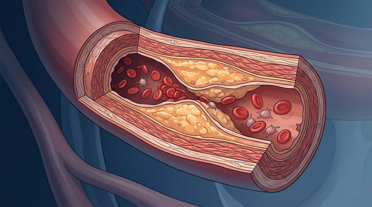 O excesso de LDL, conhecido como colesterol ruim, se deposita na camada interna dos vasos sanguíneos e desencadeia uma reação inflamatória crônica. Com o tempo, essa inflamação forma placas de aterosclerose que estreitam e endurecem as artérias.