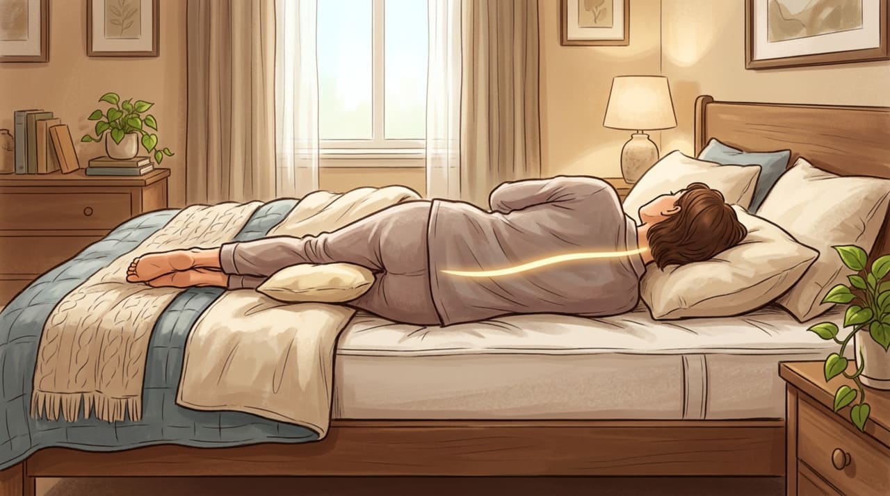 Dormir de barriga para cima ou de lado com apoio adequado ajuda a reduzir a sobrecarga nas costas.