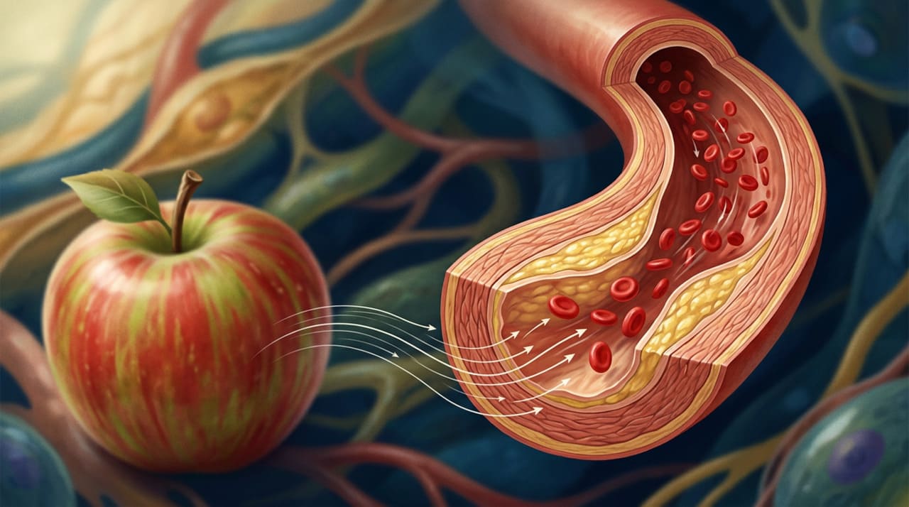 Os efeitos da maçã sobre os níveis de colesterol são respaldados por evidências científicas robustas. Segundo o estudo Two apples a day lower serum cholesterol and improve cardiometabolic biomarkers in mildly hypercholesterolemic adults, publicado no periódico American Journal of Clinical Nutrition e indexado no PubMed, adultos com colesterol levemente elevado que consumiram duas maçãs diárias durante 8 semanas apresentaram redução significativa nos níveis de colesterol total e LDL.