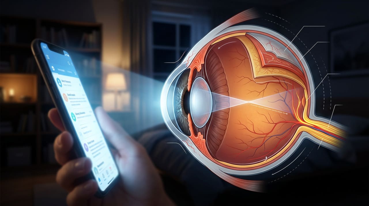 A luz azul emitida por telas pode atrapalhar a produção de melatonina, hormônio responsável por induzir o sono, prejudicando o descanso noturno. Além disso, a exposição frequente contribui para o ressecamento e o cansaço visual.