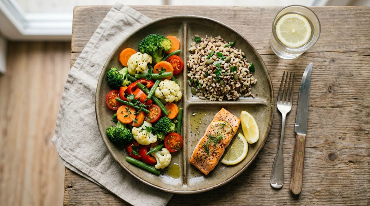 O melhor jantar para esse quadro costuma seguir uma lógica simples: metade do prato com vegetais, uma porção de proteína magra e uma quantidade moderada de carboidrato de melhor qualidade. Esse tipo de refeição ajuda a evitar exageros calóricos, reduz picos de açúcar no sangue e costuma ser mais favorável para quem precisa diminuir gordura no fígado.