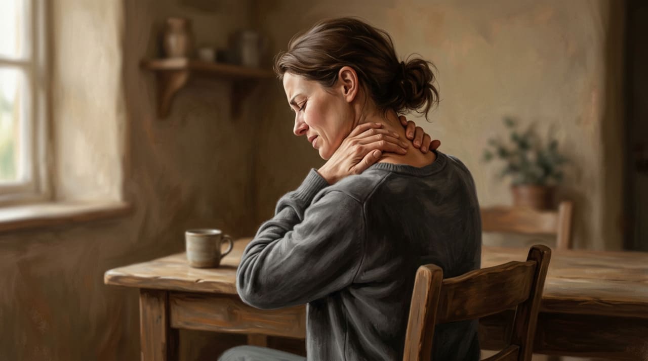 Cena mostra dor cervical e tensão muscular crônica na região da nuca e dos ombros
